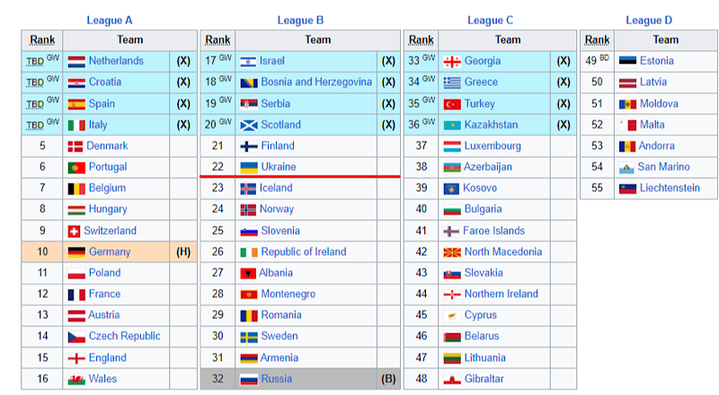 До плей-офф кожного з Дивізіонів повинні вийти чотири найкращі команди останнього розіграшу Ліги націй у кожному з перших трьох Дивізіонів. Україна була у Дивізіоні В, тож для українських вболівальників найперше цікавий він. Чотири найкращі команди тут – це Ізраїль, Боснія та Герцеговина, Сербія і Шотландія. Далі йдуть Фінляндія та Україна. Тобто, наша збірна – шоста у черзі на чотири місця в плей-офф.