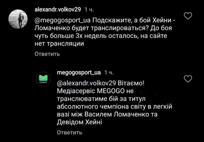 Крупнейший медиасервис Украины не будет показывать сражение. Об этом они сообщили в комментариях на своей странице в Instagram.